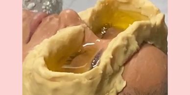 Medicated herbal oil is applied within a dough ring on back, neck, or knee to reduce pain and inflammation.